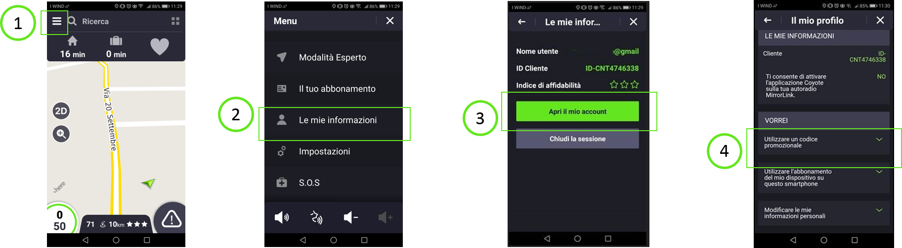 - Scarica gratuitamente l'applicazione Coyote, crea un profilo cliente o utilizza le tue credenziali se se già cliente Coyote